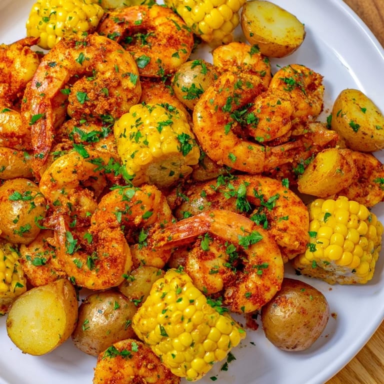 Save A vibrant, flavor-packed platter featuring spicy Cajun shrimp, sweet corn on the cob, and roasted potatoes, perfect for a festive meal or summer gathering.