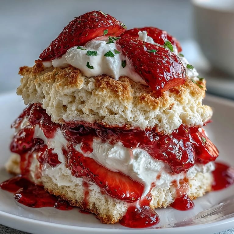 Serve strawberry shortcake immediately after assembly for the best texture contrast—warm biscuits, cool cream, and room-temperature berries create an irresistible experience. Present individual shortcakes on dessert plates with extra strawberry syrup drizzled around the edges. For a casual gathering, set up a shortcake bar where guests can assemble their own portions, choosing their preferred ratio of fruit to cream. Pair with a glass of sparkling wine, sweet dessert wine, or simply fresh lemonade. Any leftover biscuits make wonderful breakfast treats split and toasted with butter and jam. Store components separately: biscuits in an airtight container at room temperature for up to 2 days, macerated strawberries refrigerated for up to 24 hours, and whipped cream covered in the refrigerator for up to 4 hours. Reassemble just before serving to maintain that perfect textural harmony.