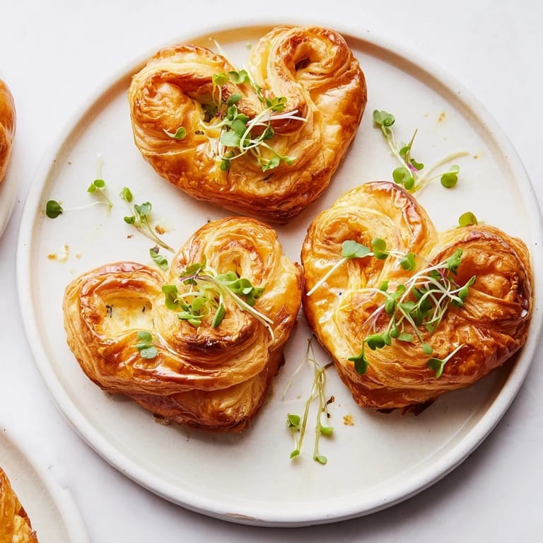 Save A romantic and elegant appetizer featuring crisp puff pastry hearts intertwined and filled with creamy goat cheese, sweet roasted peppers, and fresh herbs—perfect for sharing with your loved one.