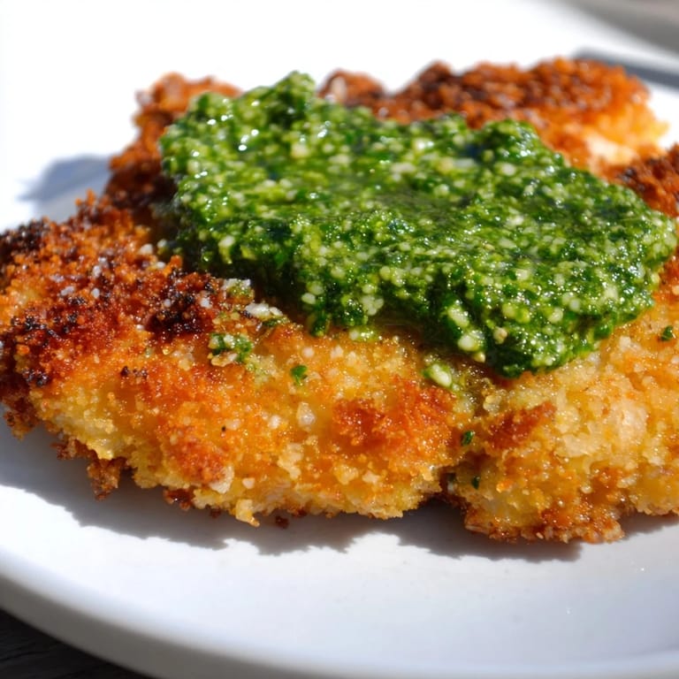 If you want to switch things up, try swapping the basil pesto for sun-dried tomato pesto or even a lemony arugula sauce, both of which bring their own brightness to the crispy chicken. You can also add a pinch of red pepper flakes to the breadcrumb mixture if you like a little heat, or use pecorino instead of Parmesan for a sharper, more assertive flavor. I've made this with turkey cutlets when that's what I had on hand, and it worked beautifully, the breading crisps up just the same and the lean meat stays moist as long as you don't overcook it.