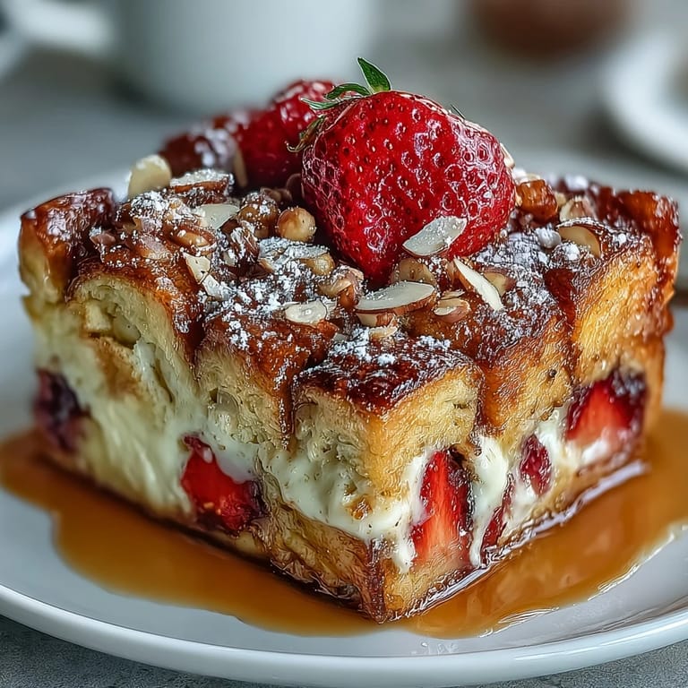 The secret to this casserole's irresistible texture lies in the custard: a luxurious blend of eggs, whole milk, heavy cream, vanilla, and a whisper of cinnamon that seeps deep into every cube of brioche overnight. Come morning, those golden pillows have soaked up every drop of flavor, and the streusel topping bakes into a crisp, caramelized crust that contrasts beautifully with the soft, custardy interior beneath. Finished with a dusting of powdered sugar, a drizzle of maple syrup, and a scattering of fresh strawberries, this is brunch food at its most celebratory.