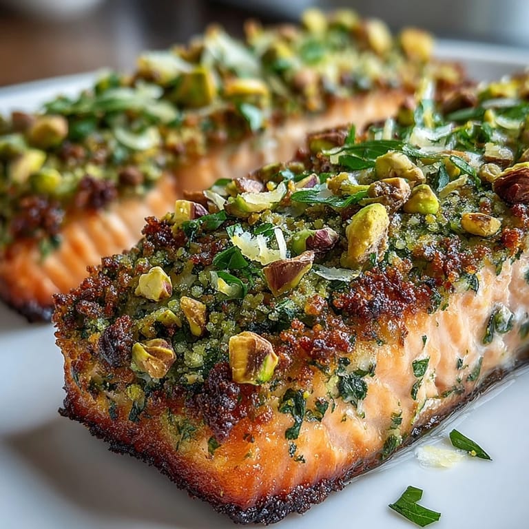 Save My neighbor handed me a pistachio-crusted salmon filet at a dinner party last spring, and I nearly missed it—too busy talking by the kitchen counter. But one bite stopped the conversation cold. The crust crackled between my teeth while the salmon inside stayed buttery and tender, and I found myself asking for the recipe before dessert was even served. Turns out, it wasn't complicated at all, just pistachios, fresh herbs, and the confidence to press them onto fish without overthinking it.