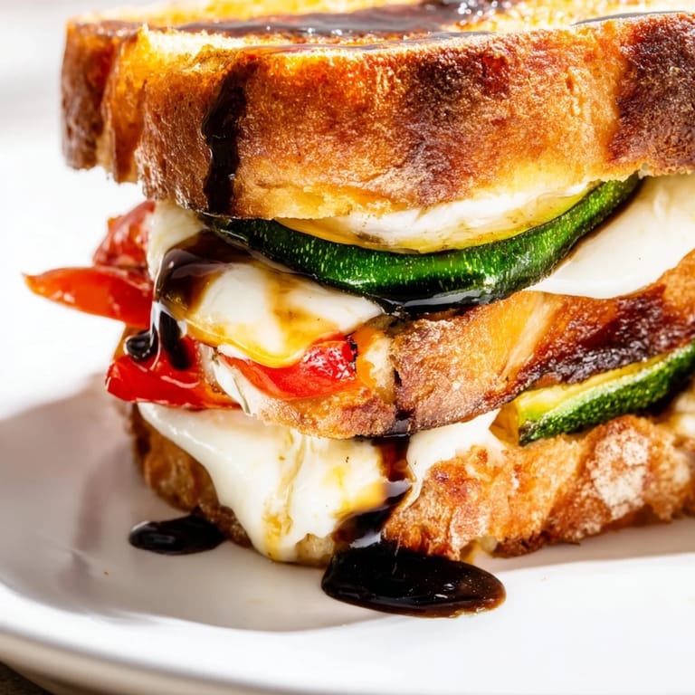 Save The smell of roasting peppers always pulls me into the kitchen, no matter what else I'm doing. I stumbled onto this combination during a summer when my garden produced more zucchini than I knew what to do with, and now it's become the sandwich I crave when rain starts tapping against the windows. Something magical happens when those charred, sweet vegetables meet milky mozz