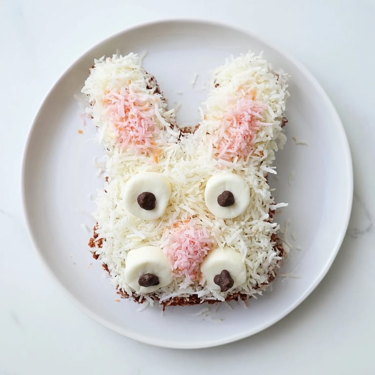 Shredded coconut is sprinkled over the frosting to mimic fluffy fur.