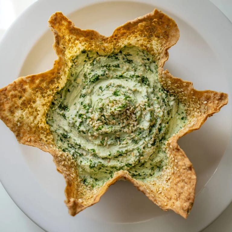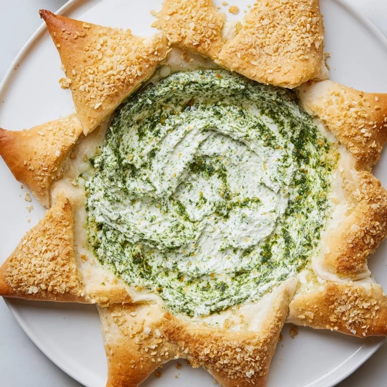 Save Bring a touch of festive elegance to your gatherings with this Star-Shaped Pesto Dip with Cracker Edges. Combining a creamy, herbaceous pesto center with golden, flaky puff pastry edges that double as crunchy crackers, this appetizer is as delightful to look at as it is to eat. Perfect for holiday parties or any occasion calling for a savory treat, this Italian-inspired dish balances creamy cheeses, fragrant basil pesto, and a hint of garlic in a visually striking star shape.