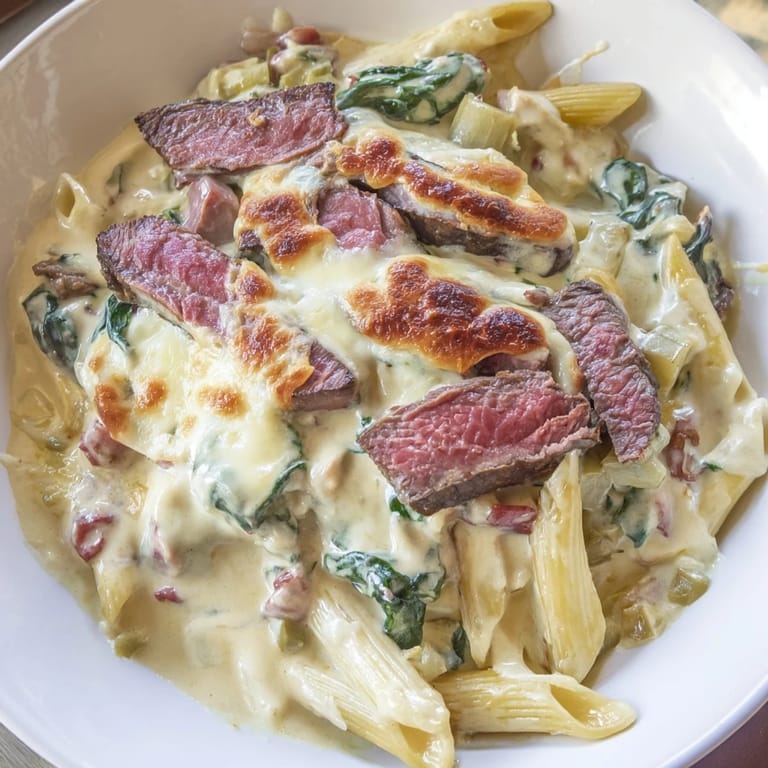 Save A creamy, hearty baked pasta loaded with tender slices of steak, vibrant spinach, tangy artichokes, and a golden layer of melted mozzarella. Perfect for cozy weeknight dinners or entertaining guests.