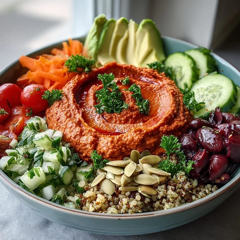 Save There's something about assembling a Buddha bowl that makes you feel like you're building art on a plate. I discovered these roasted red pepper hummus bowls during a particularly hectic week when I needed meals that felt both nourishing and effortless, something I could prep without much fuss but wouldn't bore me by Wednesday. The moment I blended those silky chickpeas with charred red peppers, the whole kitchen smelled like a Mediterranean market, and I knew I'd found something special. Now they're my go-to when I want to feel grounded and actually enjoy what's in front of me.